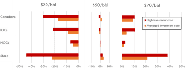 A peer comparison across a range of commodity price scenarios shows that Canadian oil and gas companies are more exposed to value erosion from new upstream investment than integrated oil company and national oil company peers, especially under fast-transition conditions.